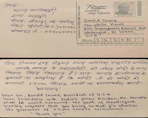 सूरज ने अपने पत्र में लिखा है कि भारत के प्रधानमंत्री नरेंद्र मोदी, डोनाल्ड ट्रंप के ‘परम मित्र’ हैं. ऐसे में उन्होंने ट्रंप से आग्रह किया है कि वे अपने मित्र मोदी को छत्तीसगढ़ में घोषित 57,000 शिक्षकों की भर्ती ‘मोदी की गारंटी’ को शीघ्र पूरा कराने के लिए कहें.